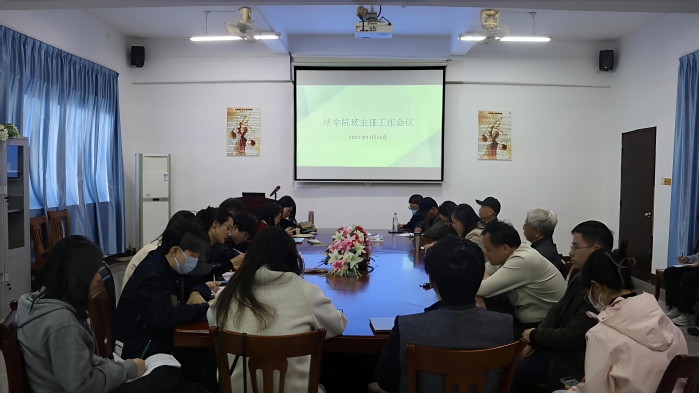 为迎接即将到来的本科教育教学审核评估工作,11月26日下午pg娱乐电子游戏官网入口于法律诊所召开了全体班主任、辅导员专项工作部署会议。本次会议由pg娱乐电子游戏官网入口党总支书记兼副院长杨勤主持,pg娱乐电子游戏官网入口党总支副书记林媛、pg娱乐电子游戏官网入口全体辅导员及班主任参加本次会议。