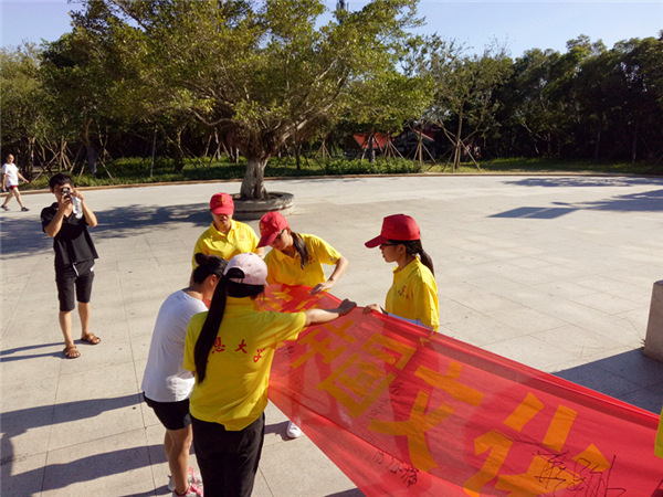实践队员将问卷调查分发给游客,向他们解释问卷的内容,还与游客一起交流关于保护文物的问题等。整个过程中,游客十分热情地响应我们的号召,积极配合参加我们的活动,并提出一些关于保护万寿塔的建议。活动最后,实践队邀请游客在横幅上签名,表明了对保护万寿塔的坚定。