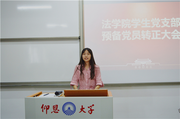 会上,预备党员宣读转正申请书,汇报预备期内自己在学习、思想、生活、工作等方面的情况。期间,入党介绍人根据各预备党员在校表现进行了详细的介绍,党内同志认真倾听并进行充分讨论。经全体与会正式党员举手表决,10名预备党员均全票通过,同意按期转为中共正式党员。此外,支部还为转正党员同志准备“政治生日”贺卡和蛋糕;并在张容同志的带领下,转正党员右手握拳举过肩头,面向鲜红的党旗,逐句庄严宣誓。会议在铿锵有力的“随时准备为党和人民牺牲一切,永不叛党”的誓词中落下帷幕。