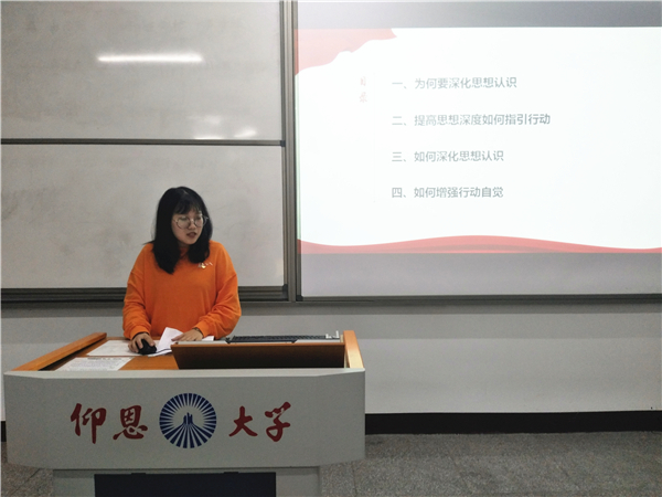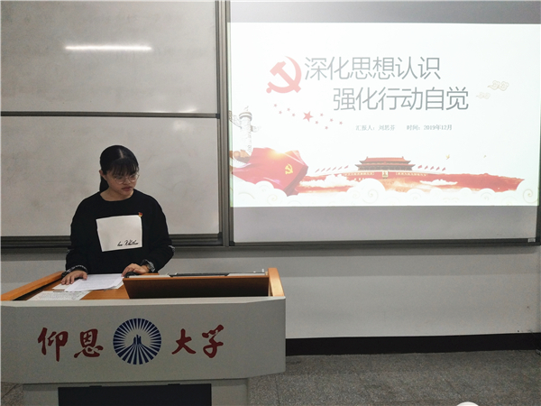 本次学习会主要围绕“深化思想认识,增强行动自觉”进行展开。会上,李小康、刘思芬、林聪婉等同志分别从“深化对习近平新时代中国特色社会主义思想的认识”和“把抓思想认识放在首位”等方面入手,强调了作为一名学生党员必须不断深化对习近平新时代中国特色社会主义思想的认识,深化对党的初心和使命的认识,以思想先进引领实践先行,更加自觉地为新时代党的历史使命而努力奋斗。