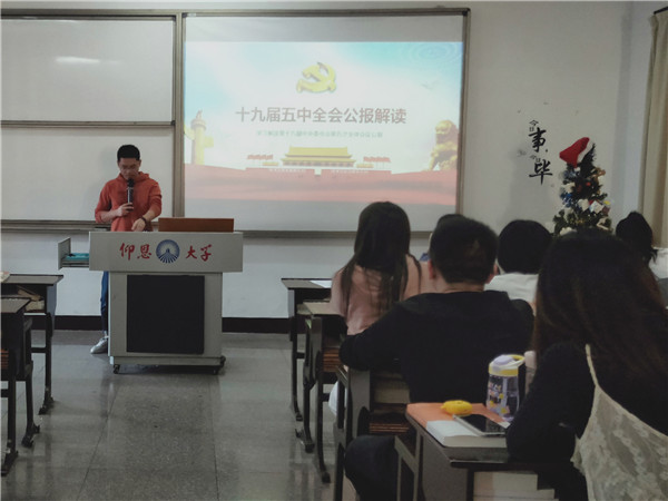 11月16日下午,pg娱乐电子游戏官网入口学生党支部于pg娱乐电子游戏官网入口第三校区普照楼302开展《中国共产党第十九届中央委员会第五次全体会议公报》专题学习会,会议由支部书记陈国伟主持,支部全体学生党员参加本次活动。