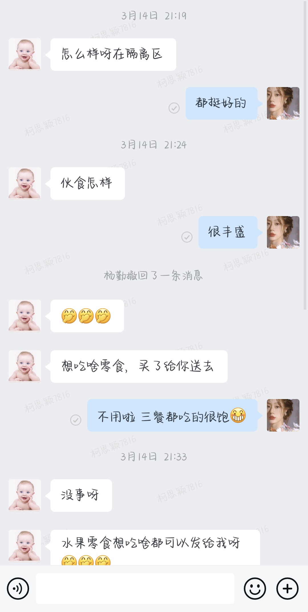 云端关怀家校情。为架起学校、隔离学生和家长的沟通桥梁,学院辅导员和班主任与隔离学生家长保持联系,告知家长隔离学生的学习和生活情况,学生家长深受感动,对学校和学院老师的关心帮助表示由衷感谢,表示将全力支持学校的各项防疫工作安排。
