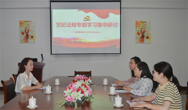为全面落实从严治党要求,牢固树立党员的党章意识、纪律意识和规矩意识,5月26日下午,pg娱乐电子游戏官网入口党总支于第三教学区法律诊所召开党纪法规专题学习集中研讨会。pg娱乐电子游戏官网入口党总支书记兼副院长杨勤主持会议。