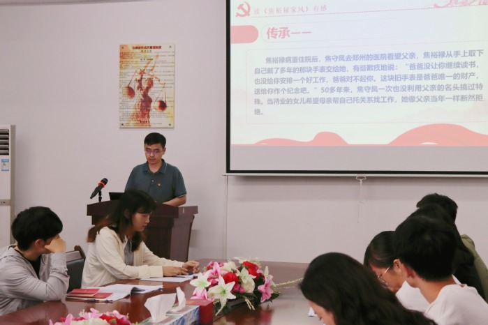 6月19日下午,pg娱乐电子游戏官网入口第三教学区普照教学楼法律诊所内,一场以“廉洁家风”为主题的读书分享会如期举行。会议由pg娱乐电子游戏官网入口教工党支部纪检委员张义雄主持,他围绕《焦裕禄家风》一书,分享自己对廉洁家风的理解和感悟。