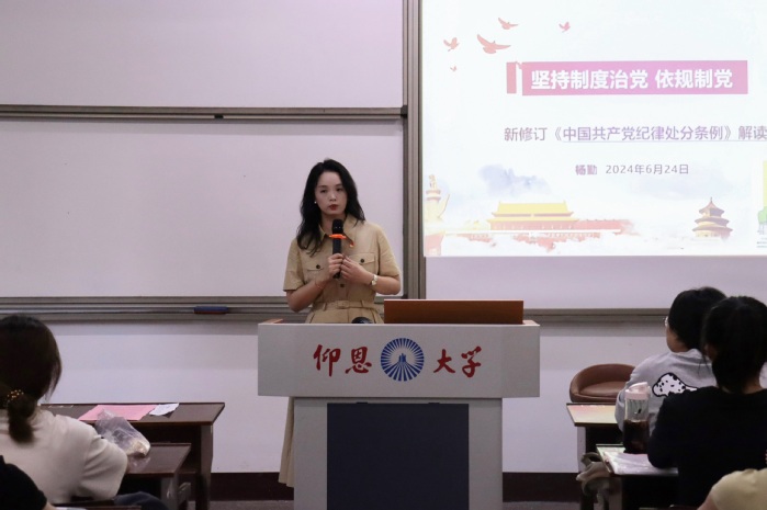 为贯彻落实全面从严治党要求,引导广大党员真正做到“学纪、知纪、明纪、守纪”。6月24日,pg娱乐电子游戏官网入口党总支书记兼副院长杨勤于普照楼204为全体学生党员开展“《中国共产党纪律处分条例》解读”主题党课,支部全体学生党员参加。