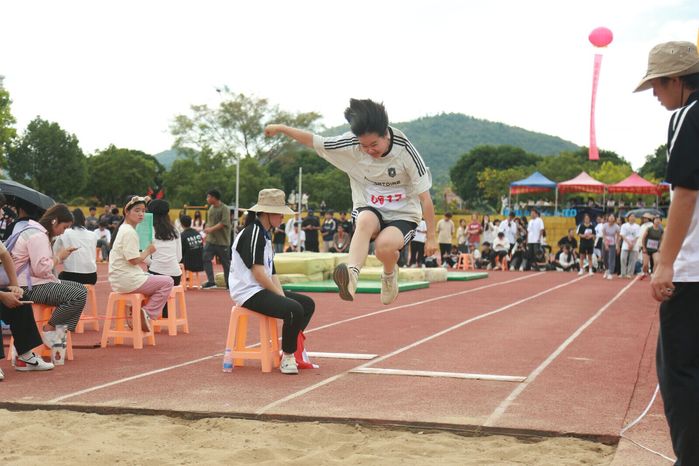跳远项目是通过助跑进而完成跳跃的一项运动。助跑、起跳、腾空、落地,每一个步骤都是考验运动员身体的协调能力。吴晓彤同学在经历预赛的热身运动后,站在起跑线上,眼神坚定,充满自信,腾空而起,划出一道优美的弧线,做到了完美起跳,她的每一个动作都如行云流水般流畅,仿佛脱离地心引力的束缚,向着远方翱翔。最终,她凭着精湛的技艺和顽强的毅力,最终获得了女子跳远项目第六名的好成绩。