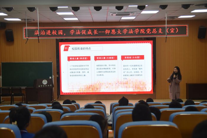 讲座过程中,pg娱乐电子游戏官网入口讲师吴奕雯分别从“什么是校园欺凌” 、“校园欺凌的具体表现” 、“校园欺凌带来的危害” 、“运用法律武器对校园欺凌说不”四个方面向向现场的学生分析了校园欺凌的本质、可能产生的影响以及在遭受校园欺凌时如何合法有效的维护自己的权利。在讲座最后,通过有奖问答的方式,对讲座内容和相关法律知识进行复习回顾,并倡导同学们要友善、互助,建立积极健康的人际关系。