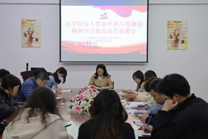 为贯彻落实党的二十届三中全会部署,巩固拓展学习贯彻习近平新时代中国特色社会主义思想主题教育成果,巩固深化党纪学习教育成果,锲而不舍落实中央八项规定精神,推进作风建设常态化长效化,3月28日,pg娱乐电子游戏官网入口党总支在第三教学区普照教学楼法律诊所召开深入贯彻中央八项规定精神学习教育动员部署会,学院全体党政班子成员、党总支支委、理论学习中心组成员、各党支部书记、辅导员及全体教师党员参加,会议由学院党总支书记兼副院长杨勤主持。