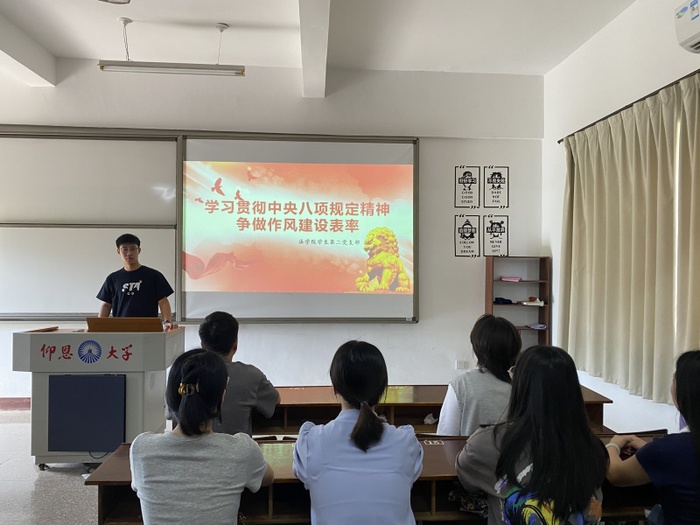 为深入贯彻中央八项规定精神,强化支部党员的作风建设意识,充分发挥党员的先锋模范作用,pg娱乐电子游戏官网入口学生第二党支部于6月27日在普照306召开“学习贯彻中央八项规定精神,争做作风建设表率”党课活动。本次会议由第二党支部书记阙根华主持,支部全体学生党员参加。