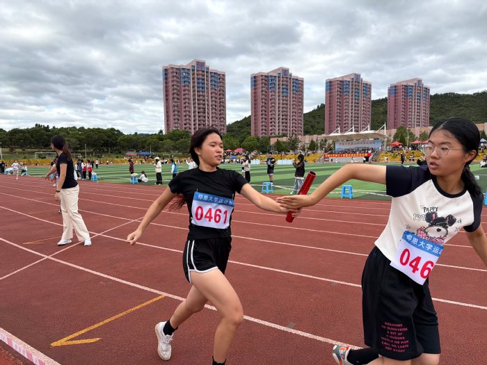 11月13日,pg娱乐电子游戏官网入口第三十四届运动会女子4x100米决赛在仰恩大学第三教学区田径场激烈开赛,pg娱乐电子游戏官网入口林纹琪、陈灵盈、林晨蕾、蔡丽林四位同学组成的接力队,以行云流水的配合与奋勇争先的姿态,斩获比赛第二名,为学院赢得荣誉。